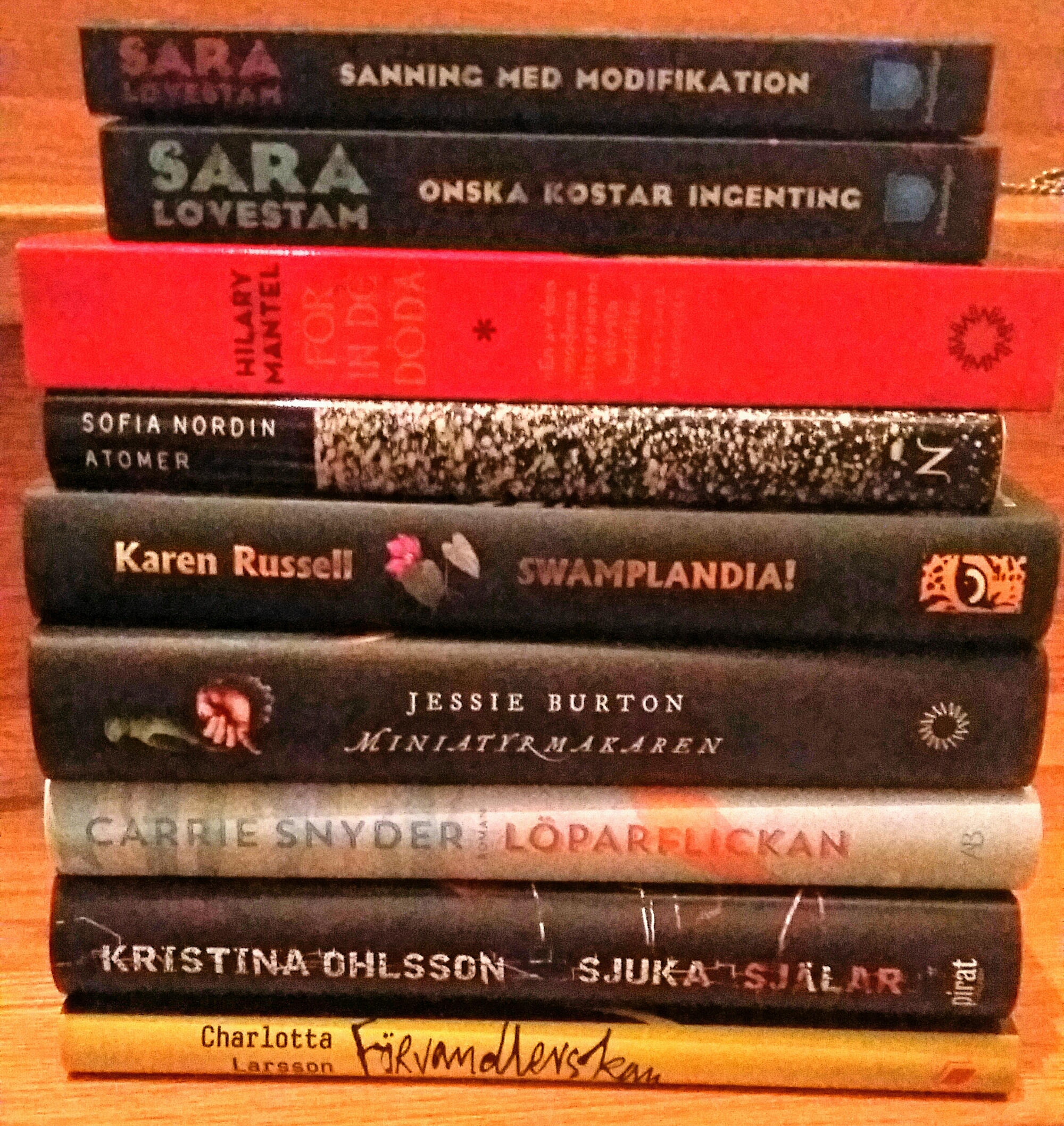 Det blev några till, på nätbokhandeln denna gång. En del har jag varit sugen på ett tag, en del är impulsköp och Miniatyrmakaren är faktiskt till bokcirkelns kommande träff. Jag har redan läst Sara Lövestams första Kouplanbok som ett e-lån på bibblan men eftersom hon är en av mina största favoriter kände jag ett ägbegär. Jag insåg när leveransen kom att jag har Wolf hall på engelska men nu köpte För in de döda på svenska. Bummer. Nu har jag faktiskt inte ens läst Wolf hall än men jag brukar föredra att läsa serier på samma språk. Jaja. Ohlsson är väl en deckarförfattare men då Sjuka själar marknadsfördes som en skräckbok blev jag nyfiken.