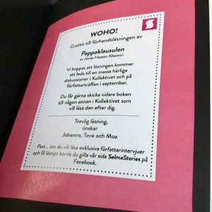 Jag skrev häromdagen om att det var tack vare mina (fysiska) bokcirklar som jag faktiskt fått något läst i våras. Nu är det ju så att jag till och från också deltar i några nät-bokcirklar vilket jag definitivt kan rekommendera! Den braiga bloggen Kulturkollo har sedan ganska länge en grupp på Facebook som heter Kulturkollo läser. Där läses just nu Bonjour Tristesse av Françoise Sagan och diskussionerna startar 13 augusti. Är du intresserad kan du läsa mer här.På Facebook finns också gruppen Kollektivet – en bokcirkel som drivs av Selma Stories vilket är en del av Bonnierförlagen. I våras lästes Ett jävla solsken av Fatima Bremmer och jag började hänga på men kom sen av mig, det är därför den boken ligger i min sommarhög nu. Därefter lästes Låt oss hoppas på det bästa av Carolina Setterwall men den var jag inte med på. För någon vecka sedan slängde de ut en förfrågan om vi ville förhandsläsa Pappaklausulen av Jonas Hassen Khemiri. Såklart att jag ville och jag hade turen att bli en av de lyckliga! Jag började på den igår och tänkte försöka läsa ut den rätt snabbt så att jag kan skicka den vidare till någon av gruppens medlemmar som inte hann tag i ett ex. Snacket om Pappaklausulen sker löpande och är redan igång så smått.De nätbaserade bokcirklarna är ett bra alternativ för dig som inte har en egen fysisk bokcirkel och för dig som helt enkelt inte får nog av att snacka om böcker! Har du tips på fler online-cirklar?