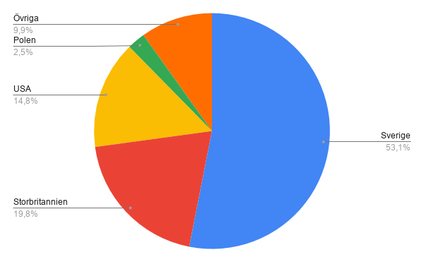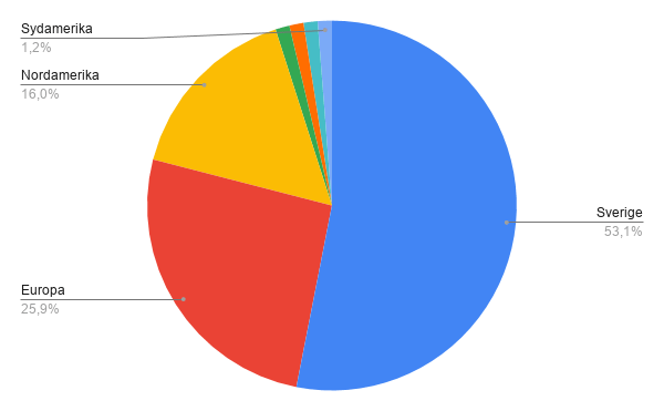 Edit: Även jag blev tvungen att lägga in ett diagram över fördelningen över världsdelar med Sverige separat så som Hanna gjort. (Varför just Sydamerika fick stå med som text när både Sydamerika, Asien, Afrika och Oceanien representeras av en bok vardera får du fråga Googles Kalkylark om.)