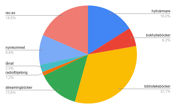 Kommentar: Ursprunget är min största akilleshäl på så vis att jag tenderar att läsa alltför lite ur min egen hylla. På diagrammet kan man se rätt tydligt att hälften är lånad litteratur medan den övre halvan är böcker som fanns hemma hos mig eller kommit under året. Och av den hälften så är det i sin tur hälften som är böcker som bott hos mig i ett år eller mer och den kategorin jag vill skära ner mest på, alltså inte som i sluta läsa dem utan i syfte att minska ner mängden.