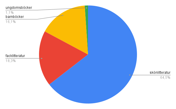 Kommentar: Jag läste färre böcker i år men mer i linje med hur jag brukar ligga till då förra året blev hysteriskt. Ett lite inofficiellt mål i år var att läsa färre böcker eftersom jag har så galet många andra intressen. Ca 37 av de 93 böcker jag läste är serieromaner, noveller och barnböcker vilka alla går väldigt snabbt att läsa och utan dem så hamnar jag någonstans runt 60 vilket var antalet böcker jag läste under ganska många av bloggens år. Men på senare år har jag ju börjat räkna med barnböcker också, i början högläste jag ju mycket för mina egna barn och räknade inte in de böckerna i statistiken men nu läser jag barnböcker som är recensionsex bara för mig själv. E-böckerna har minskat ganska mycket i antal mot förra året vilket beror på att jag läst färre streamingböcker och andelen böcker på engelska uppgår i år till nästan en fjärdedel, kul!