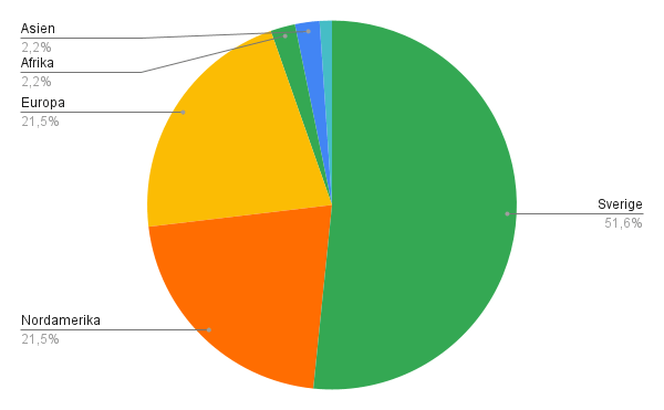 Eftersom jag läser så himla mycket svenskt bryter jag ut Sverige ur Europa i diagrammen. Sydamerika fortsätter att för evigt vara min svaga punkt när det gäller att läsa från omvärlden. Om ett par år när jag betat av tillräckligt många hyllvärmare kan jag kanske ha det som ett tema?