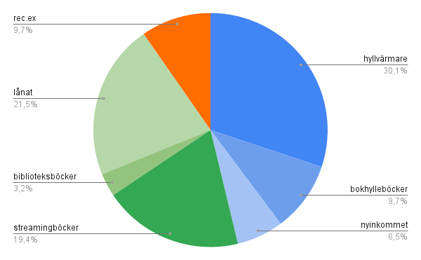 Kommentar: Det här är andra året i rad som jag lyckas läsa väldigt många av mina egna böcker. Strax över 45 % kommer ur min egen bokhylla och jag är maxnöjd med det resultatet. Förra året var det ca 25% men ser jag till antalet så var det bara ett par böcker fler i år än förra året. Jag läste ju så många fler böcker förra året så procenten blir på ett sätt lite missvisande. Tidigare bloggår har jag ofta läst kanske 3 hyllvärmare på sin höjd men nu har jag blivit galet strukturerad och jag gillar det!