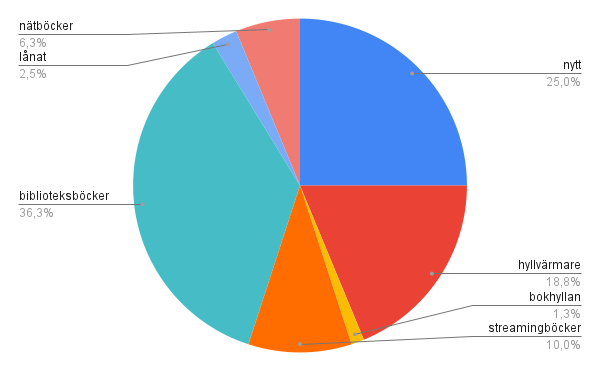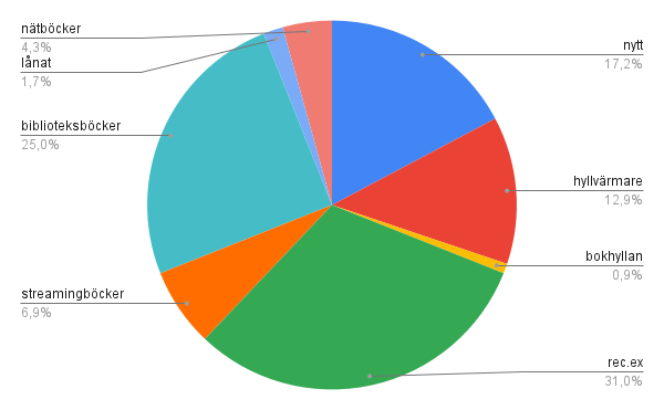Kommentar: Den här kategorin existerar eftersom jag sedan ett par år tillbaka försöker läsa mer ur min egen bokhylla. Detta har gått riktigt bra de senaste åren även om det såklart alltid går att förbättra. Alla recensionsexemplar jag har med är till Barnboksprat så jag tyckte det var intressant att se hur min läsning ser ut utan dem och det visade sig då att ca 45 % av allt jag läser är från min egen hylla. Jättebra ju!