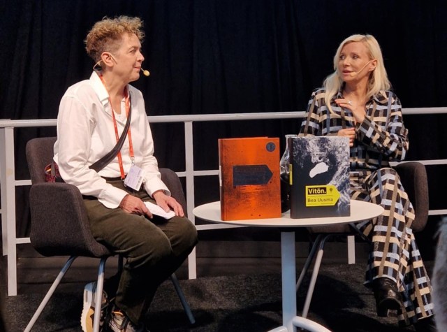 Det allra sista samtalet för mig blev en intervju med Bea Uusma om uppföljaren till Expeditionen: Vitön. Hon är så otroligt fascinerande att lyssna till och jag bara älskar folk som är så nördiga i ett ämne som hon är. När hennes bokförlag (gissar jag) ställde upp ett stort snyggt ex. av Expeditionen jämte Vitön på bordet på scenen så tänkte jag ”åh nej, jag hade så gärna velat ha den också i det här formatet, så synd att den är slutsåld”. Jag läste den för några år sedan i en bokcirkel men köpte bara ett enkelt pocket-ex då. Gissa om jag blev lycklig (och om det blev tungt, böckerna väger 1.4 kg styck enligt Bea) när jag i signeringskön insåg att jag kunde köpa båda böckerna i storformat!