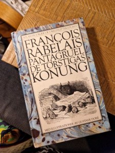 Bäst är Dorés illustrationer, sämst är humorn. Det är kiss- och bajshumor, ordbajsande, onödigt långa resonemang och förklaringar och en förkärlek för uppradning à la Odysséens skeppskatalog. Det finns förvisso en del språkhumor och satir som dock ofta går mig förbi eftersom jag inte har 1500-talets kontext glasklar för mig. Jag uppskattade också när faktiska historiska platser nämndes vilket gav mig något att googla på.